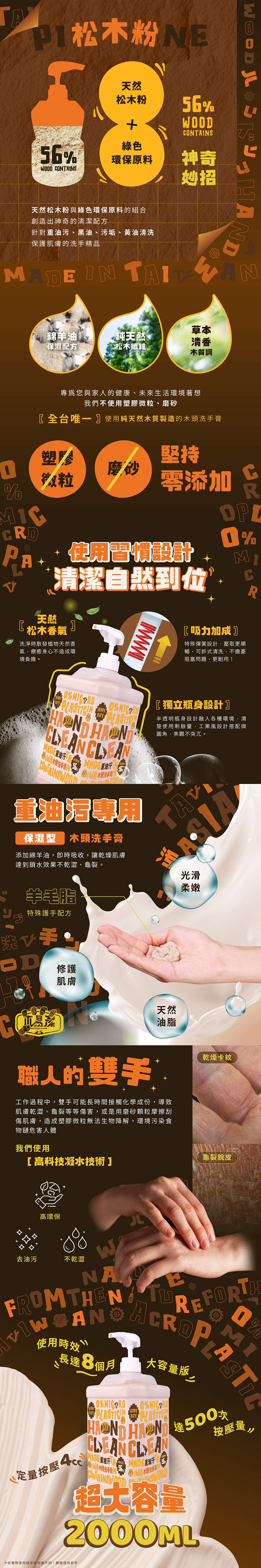 天然松木粉與綠色環保原料組成的神奇配方,為雙手帶來超乎想像的清潔力,一掃油汙小怪獸!