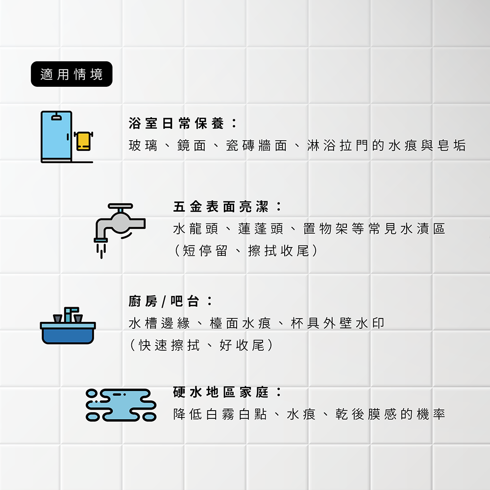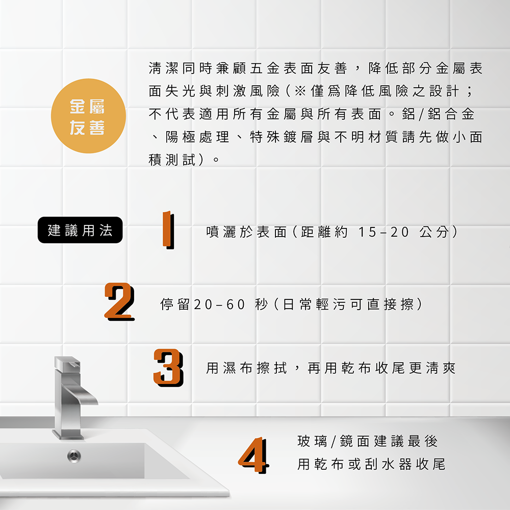 【使用方法】噴灑於水痕處或預防區域,靜置 1-3 分鐘,使用海綿或布擦拭乾淨,無需強力刷洗,可作為每日保養清潔劑使用。
